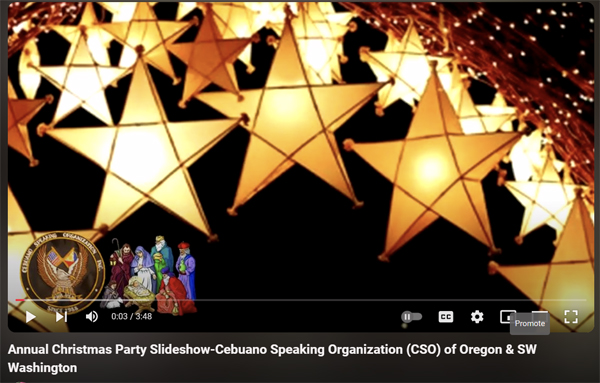 The Cebuano Speaking Organization (CSO) of Oregon & Southwest Washington's Christmas video presentation featuring the 2015 school recipients of their Paper & Pencil Projects: Bagong Lipunan Elementary School, Dacudao Elementary School, Dacudao High School, Baybayon Elementary School.